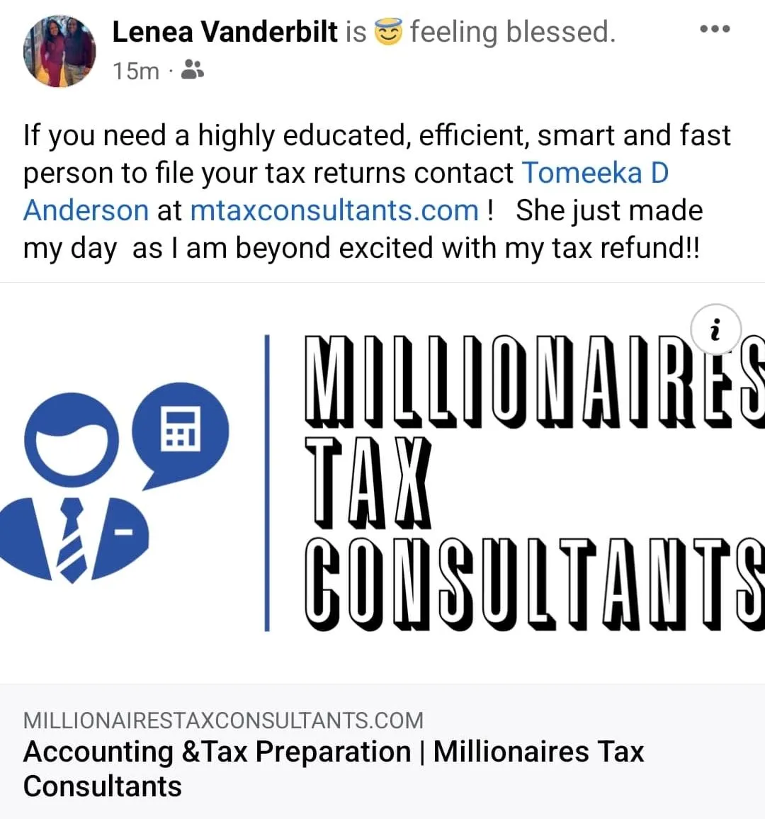 Connect and communicate with like-minded, motivated professionals, business owners, and tax preparers in our exclusive Millionaires Tax ConsultantsFacebook group.